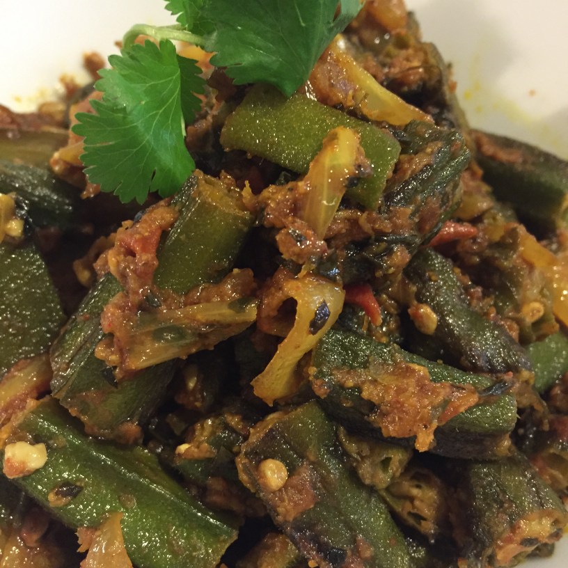 Ingredients: 2 tbsps vegetable oil 2 cups fresh okra or bhindi ½ cup sliced onions ½ cup diced tomatoes 1 large clove garlic, mashed into a paste 1 inch piece ginger, grated fresh cilantro salt to taste Spices: 1 tsp coriander powder ½ tsp cumin powder ½ tsp mild chilli powder (Kashmiri chilli pd) ¼ tsp turmeric 1/8 tsp amchur powder 1/8 tsp garam masala 2 tbsps dry fenugreek leaves or kasoori methi Method: Prepare okra by washing it and drying it completely with a kitchen towel. It helps if you let the okra sit for about 15 minutes on your kitchen counter so they dry out some more. Cut off the heads and tails of the okra, and cut the mid section into 1 inch length pieces. In a non-stick or well seasoned cast iron pan, add 1 tbsp vegetable oil and pan fry the okra on a medium flame until the okra is lightly caramelized and almost completely cooked. Remove and set aside. In the same pan, add the remaining 1 tbsp oil and add onions. A bit of salt at this point will help cook the onions. When they are translucent, add the ginger garlic paste. Stir for a minute or so until the garlic and ginger are no longer raw. Add all the spices to the onions and coat well. Toss in the tomatoes, a bit more salt and cook until the tomatoes are soft and mushy. Introduce the okra into the pan and mix well to let the flavors mingle. Add a bit of water, cover with a tight fitting lid and reduce the heat to low. Cook for an extra 10 minutes until the okra is fully cooked. Serve hot with soft rotis or rice.