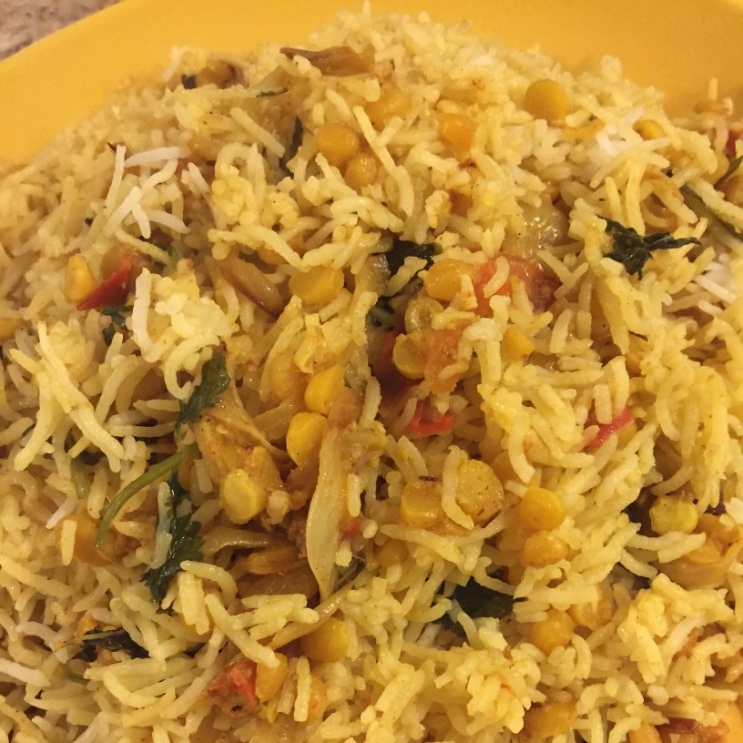This recipe involves a few stages but is well worth the time and effort. The channa daal is cooked separately with a whole array of spices. Rice is about 95% cooked in a separate pan like you might cook pasta and drained. The channa daal mixture and rice mixture are then layered alternating with a layer of fresh mint leaves, fresh coriander leaves and sweet caramelized onions. A bit of fresh ghee drizzled over heightens the experience. The entire dish is then left in a slow oven to let everything steam together. The aromas that rise from making this dish are guaranteed to make your kitchen a magnet for hungry people. Make enough for leftovers, and be more blissful.
