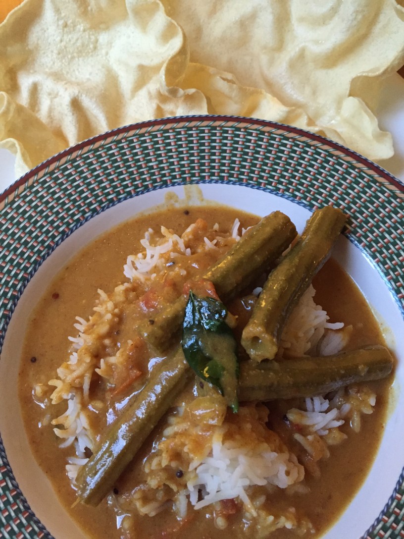 This recipe is from the southern parts of India where drumstick trees are abundant. Sambars are popularly eaten there, and are usually a stewed mixture of lentils, one or more seasonal vegetables and spices. Rice and sambar, with a poppadam or two is a typical meal in most households in southern India. A whole lot of people call this comfort food.