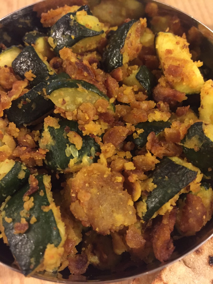 Back to our dish. I did not have coarse ground chick pea flour on hand, so am using the fine ground chick pea flour. Zucchini is diced and combined with chick pea flour, salt, turmeric, red chili powder, some asafetida, coriander and cumin seed powders. The mixture is allowed to sit for an hour or so, or until the salt draws out the moisture from the zucchini. That moisture is enough to make a light, almost tempura like batter on each zucchini cube. As you slowly stir fry the zucchini cubes, some of that light batter crisps up on the zucchini, some falls off. In the end you have a combination of textures – soft vegetable and crisps of spiced chick pea flour. Its a lovely concept. The dish is best eaten with a roti or chapati, while still hot and crispy.