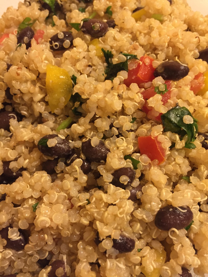 Serves 4 as a main dish Ingredients: 1 cup white quinoa, cooked and cooled to room temperature 1 small roma tomato, diced 1/2 yellow bell pepper, diced 1 15 oz can black beans, drained and rinsed 2-4 garlic cloves, very finely chopped 2 tbsps fresh cilantro, chopped finely Juice of a large lime 1/2 tsp cumin powder Salt and pepper to taste 1/4 cup olive oil Method: In a large bowl, combine all the vegetables, beans and cumin. Add lime juice and olive oil to it. Fold in cooked and cooled quinoa. Adjust seasonings and serve at room temperature or chilled. Serve as a main dish salad or a side dish.
