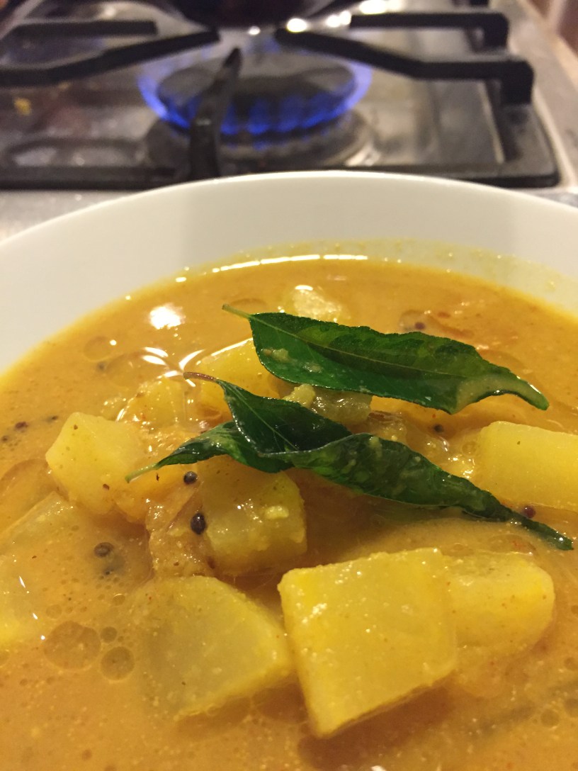 Serves 4 Cooking time: 45 mins Ingredients: 3/4 cup tuvar dal or pigeon peas, cooked in 2 cups water 2 cups diced daikon radish 1 cup diced tomato 1.5 tsp salt or per taste 1/2 tsp turmeric powder 1 tbsp jaggery 3 tbsps tamarind tighly packed Masala: 1.5 tbsp coriander seeds 1 tsp channa daal 1 tsp urad daal 1/2 tsp cumin 1/4 tsp mustard seeds 1/4 tsp fenugreek 6-8 curry leaves 2 heaped tbsps grated coconut 1 tsp kashmiri chili powder Seasoning oil: 1 tbsp vegetable oil 1 tsp black mustard seeds 1/4 - 1/2 tsp hing or asafetida 6-8 curry leaves Method: First, soak the tamarind in 1 cup hot water and leave aside for 15 minutes. Next place the tuvar daal and 2 cups water in a pressure cooker and cook per manufacturer's instructions, until the daal is very soft. Mash with the back of a ladle and set aside. While the daal is cooking, combine diced radish, tomatoes, turmeric, salt and jaggery with 2 cups water in a separate pan and set on medium heat. Once the tamarind has soaked for 15 minutes use your fingers to squeeze the pulp out of the tamarind and strain out the tamarind water. Add the tamarind water to the radish mixture while it is still cooking. The radishes will take about 20-25 minutes to get tender. When they are tender, add the mashed daal to the pan. To make the masala paste, lightly roast the coriander seeds, channa daal, urad daal, cumin, mustard seeds, fenugreek seeds, curry leaves, for about 2-4 minutes on low heat. Combine with the coconut and kashmiri chili powder and blend until very fine with 3/4 cup water. Add this paste to the radish mixture and mix well. Adjust seasonings. You might need to adjust the amount of water added as well. Sambar should have a consistency similar to a pancake or waffle batter; slightly on the thicker side. There should also be a good balance between the sourness that comes from the tamarind and the sweetness from the jaggery. So if you feel that balance needs to be adjusted, do so. Simmer the sambar an additional 5 minutes to let the flavors blend. During that time, set a small saucepan on medium heat and add the oil for seasoning to it. Drop in the 1 tsp black mustard seeds when the oil is hot. Watch for popping mustard seeds that are likely to jump on to your face! Once the mustard has popped, add the 1/4 tsp asafetida and fresh curry leaves. Serve hot with fresh ghee, rice or quinoa, and an appadam or poppadam on the side.