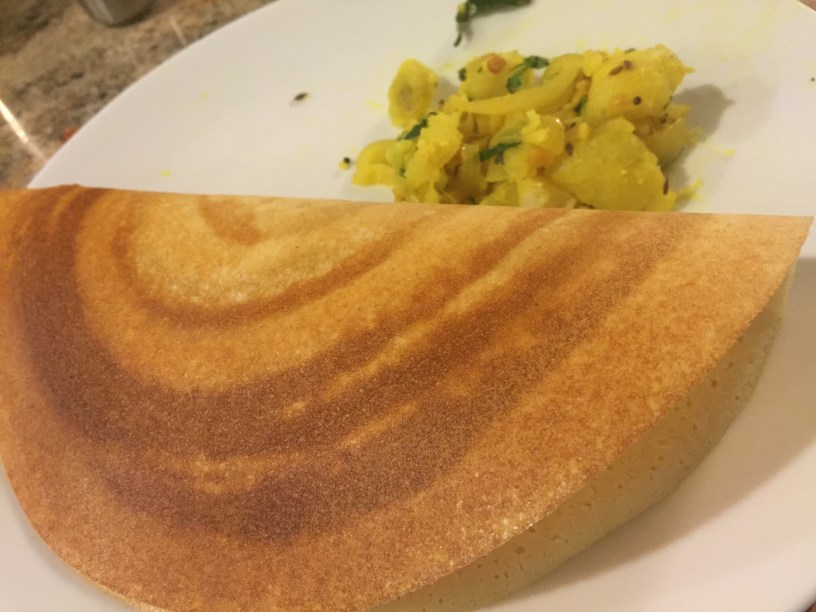 To make dosa, preheat a non-stick pan or a cast-iron dosa tava. Spritz the pan with water when you think it is hot. If the water sizzles in the first 2-4 seconds, the pan is hot. Wipe the pan clean with a paper towel, and using a round ladle, pour about 1/3 cup of batter in the center of the pan. Using the back of the ladle and starting in the center, draw an imaginary clock-wise spiral radiating outwards, until you have spread the batter into a circle. Drizzle the top of the dosa with about 3/4 tsp of oil or ghee, ensuring that the oil is spread evenly. Wait until you see the dosa turning a nice golden brown. Roll up the dosa or fold it half and serve with Spicy Potatoes.