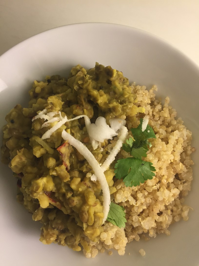 Cooking time: 30 mins Serves: 2 Ingredients: 1 cup mung beans, rinsed 2 tsps vegetable or coconut oil 1/2 tsp black mustard seeds 1/2 tsp whole cumin seeds 1/4 tsp turmeric powder 1/4 tsp asafetida 2-4 curry leaves, torn into small pieces 1 dry red chilli, broken into small pieces (use extra red chilli flakes if you like more spice) salt to taste 1 tbsp lemon or lime juice a few sprigs cilantro roughly chopped 1 tbsp fresh grated coconut Method: Pressure cook the mung daal with 2 cups water, per manufacturers directions. You need a daal that is completely cooked and soft. Once the daal is done cooking, in a separate pan, heat 2 tsps vegetable or coconut oil on medium heat. Toss in the black mustard seeds, whole cumin, asafetida, turmeric, curry leaves, broken red chilli (and chilli flakes if using). Stir the mixture to prevent burning. When the mustard seeds have popped, add the cooked daal to the pan. Season with salt. Add extra water if you feel you like the daal thinned out. Once the seasoning is tossed into the daal, take the pan off the heat. Garnish with lemon or lime juice, cilantro and coconut gratings. Serve hot with any cooked grain of your choice, with a dollop of coconut oil on top.